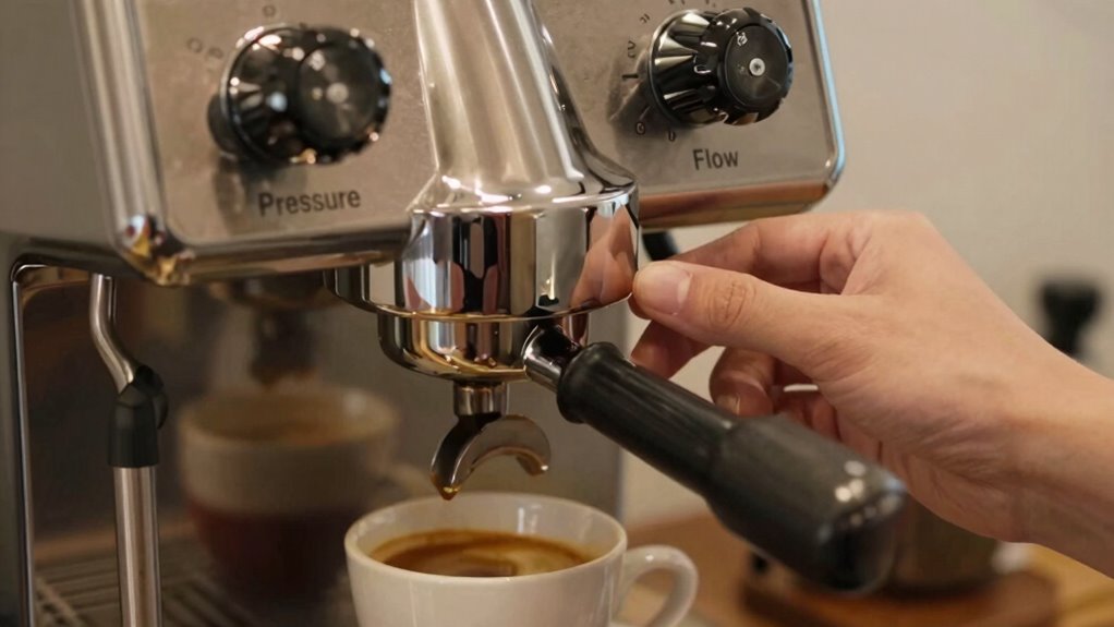 Environmental factors like barometric stability and ambient temperature markedly impact pressure and flow control effectiveness. For example, on a day with fluctuating barometric pressure, your espresso extraction may become inconsistent, especially if your machine isn’t well-calibrated. Warm temperatures can cause pressure buildup, making flow control less predictable. To maintain ideal results, keep your environment stable or adjust your machine settings accordingly, ensuring consistent extractions regardless of outside conditions.