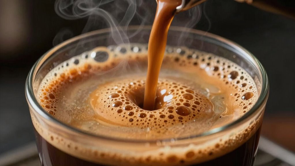 Turbo shots increase caffeine levels compared to standard pulls because their brewing process concentrates more caffeine into a smaller volume. You’ll notice a higher caffeine concentration, which delivers a stronger, more immediate energy boost. This is due to the rapid extraction process, which pulls more caffeine from the coffee grounds quickly. So, if you’re looking for a quick caffeine hit, turbo shots are more potent than regular espresso pulls.