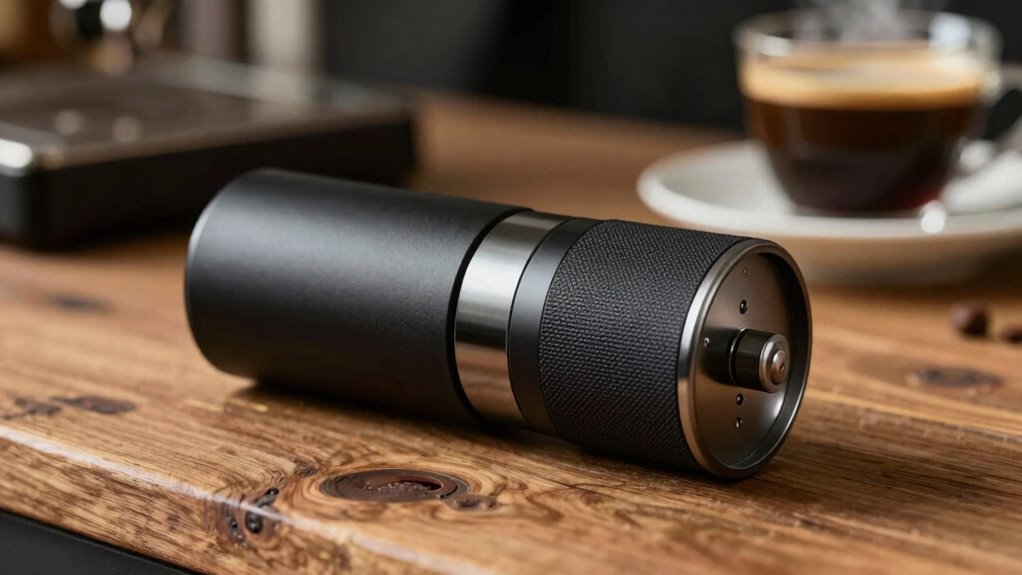 A portable espresso grinder’s stability is essential for achieving consistent results, especially when you’re on the move. To guarantee minimal wobble, focus on design features that enhance stability. Look for good weight distribution, which keeps the grinder grounded during use. Grip enhancement is also indispensable; textured or rubberized bases prevent slipping. Consider these stability features: