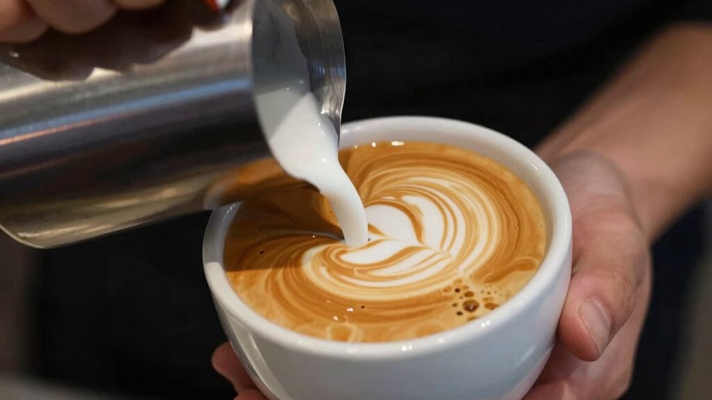 Mastering your milk pour technique is essential for creating stunning latte art. Start with properly frothed milk—aim for a smooth, velvety microfoam through attentive milk frothing. Use the right latte art tools, like a steady pitcher and a clean, narrow spout, to control your pour. Begin by pouring from a higher distance to settle the milk and then gradually lower the pitcher as you pour more slowly. Keep your wrist steady and pour in a controlled, thin stream, focusing on the center of the cup. As you gain confidence, adjust your pour speed and angle to create intricate designs. Practice consistently, paying attention to the texture of your milk and the precision of your pour, which are key to perfecting your latte art technique. Developing a good pouring technique ensures you can execute complex designs with control and finesse.