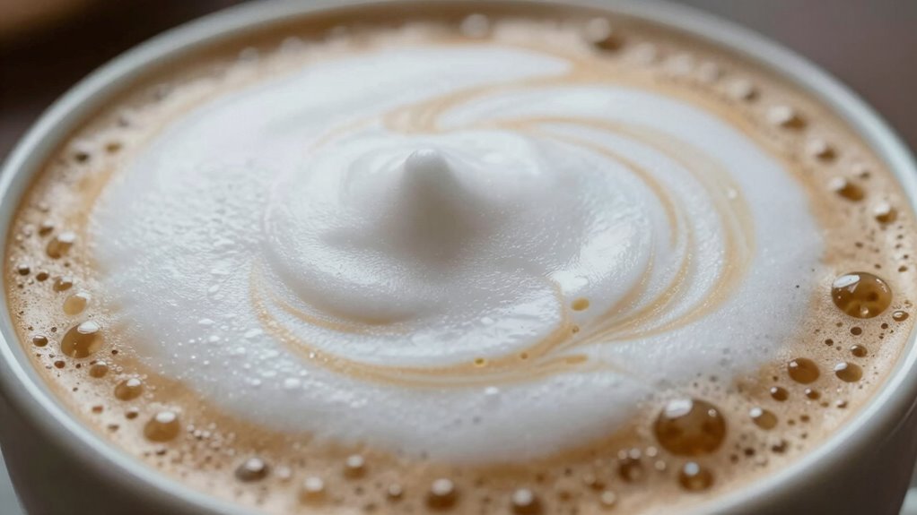 You’ll notice milk type greatly impacts microfoam quality because of its milk fat and protein content. Whole milk, with higher fat and protein, creates richer, smoother foam ideal for latte art. Skim milk, lower in fat but higher in protein, produces lighter, more stable microfoam. Choose your milk based on the desired texture; higher protein levels help achieve that wet paint, velvety finish for your latte art.