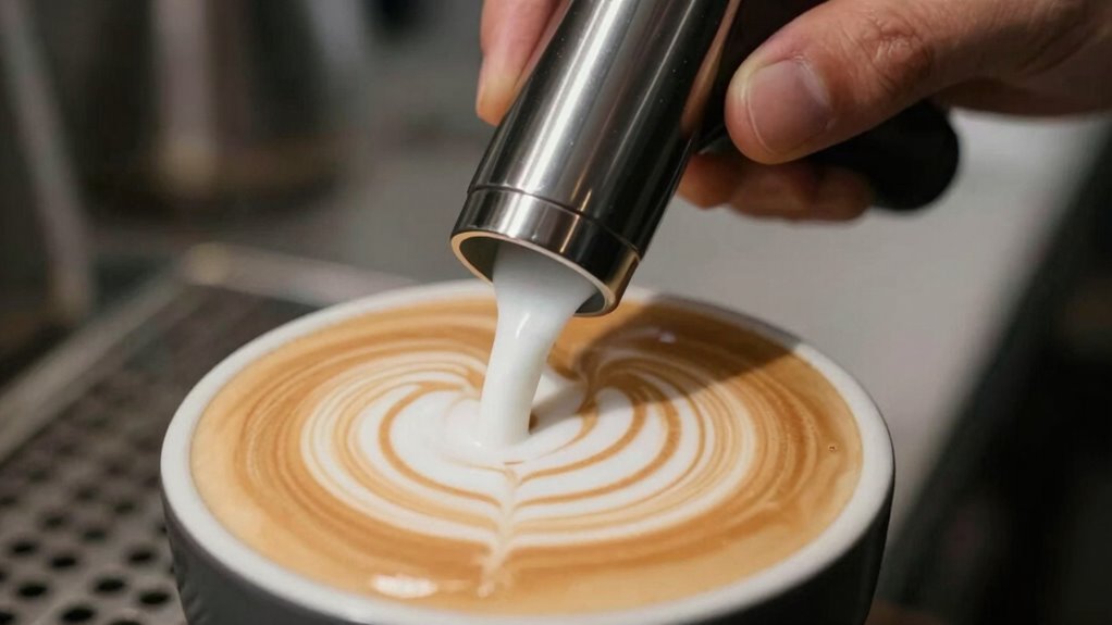 Adjusting the wand angle can considerably improve your latte art and milk texture. When you position the wand correctly, the milk steams evenly, creating a smooth, velvety texture ideal for pouring intricate designs. A proper wand angle ensures the milk flows consistently, enhancing the latte art quality. Take a moment to fine-tune your wand angle, and you’ll notice better milk texture and more impressive latte art with each pour.