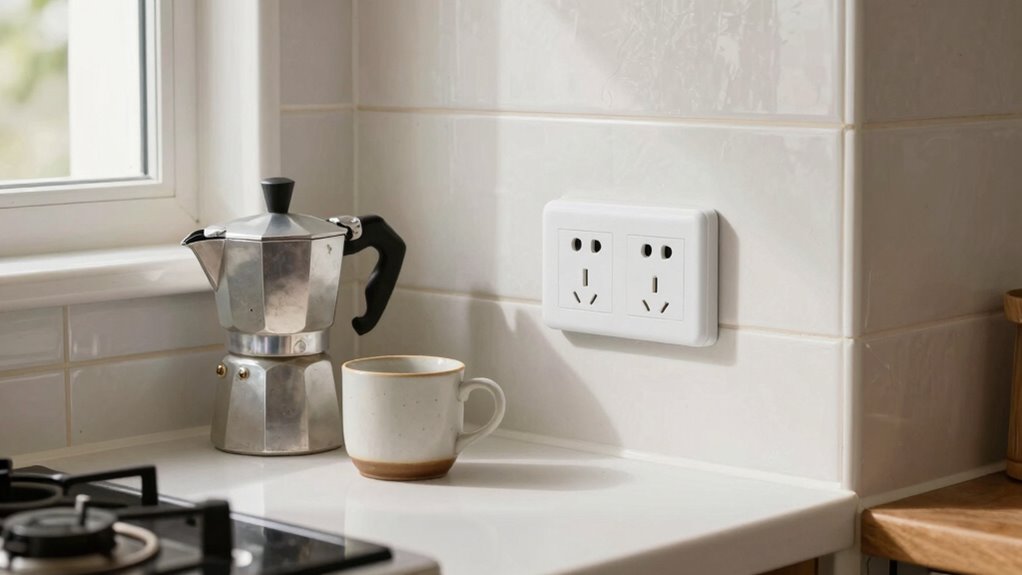 Think of your GFCI outlet as your kitchen’s safety sentinel. You should test it monthly to guarantee safety assurance. Regular testing catches potential faults early, just like a vigilant guard. Press the test button, then the reset to confirm it works properly. Consistent testing keeps your coffee corner safe, especially when water or appliances are involved. Don’t skip this essential step—your peace of mind depends on it.