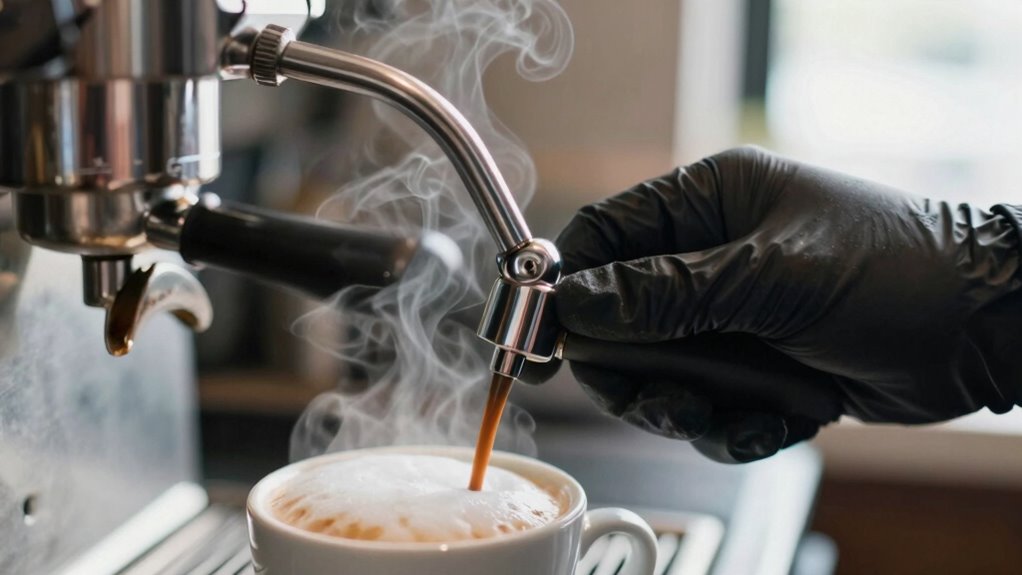 By following these simple steam wand burn prevention tips, you can avoid painful injuries and keep your coffee experience safe. Did you know that burns from steam wands account for nearly 25% of barista injuries? Staying alert and practicing these safety habits reduces your risk profoundly. Remember, a quick check before steaming and handling the wand carefully safeguards you from burns. Prioritize safety, and enjoy your coffee-making with confidence and peace of mind.