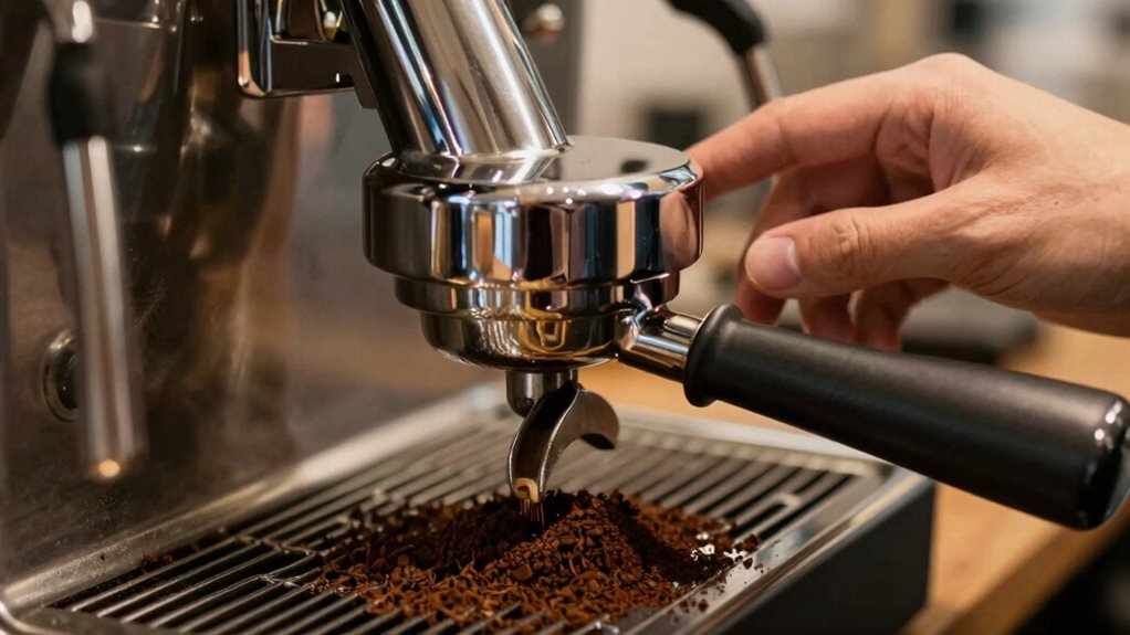 Even small adjustments to your grind can throw off your shot if you don’t make them consistently. When you change the grind size, it impacts brew temperature and tamp pressure, which are vital for extraction. To prevent choking, keep your grind setting steady once you find the right point. Always monitor your tamp pressure to guarantee it remains consistent, as uneven tamping can cause variability. Additionally, be mindful of your brew temperature, since slight changes can affect flow and shot quality. If you adjust your grind, do so gradually and always follow the same process. This consistency helps your machine produce stable shots, reducing the chances of choking after small changes. Understanding load‑planning and maintaining consistent routines are essential for more reliable espresso every time.