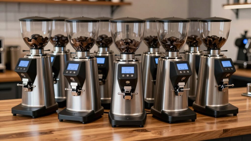 Absolutely, these grinders can handle different espresso roast profiles. I find they excel at adjusting grind size easily, which is key for different roasts—lighter roasts need a finer grind, darker ones a bit coarser. The precision of these grinders guarantees I can dial in the perfect extraction every time, no matter the roast profile. This flexibility makes them ideal for experimenting and getting your espresso just right.