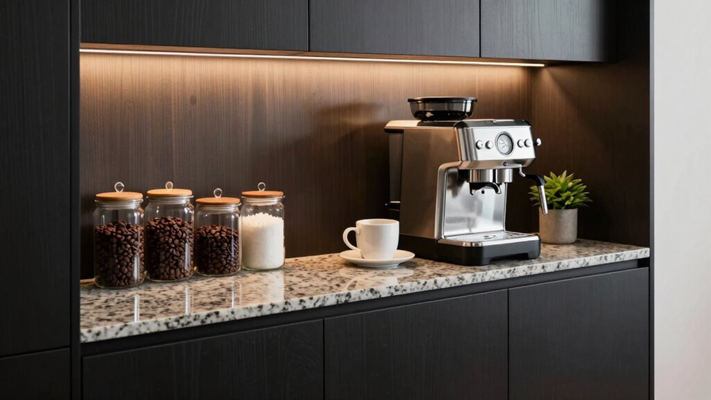 When setting up a coffee station for an office, making sure it’s accessible for everyone can considerably improve workflow and comfort. Including adjustable shelves and counters allows users of different heights and abilities to easily reach essentials. Ergonomic design elements, like handle placements and push-to-open mechanisms, make daily tasks smoother for all employees. Positioning frequently used items at waist level or within easy reach minimizes strain and boosts efficiency. Clear signage and labeled compartments help staff quickly locate and return items, keeping the station organized. Additionally, features such as non-slip mats and stable bases enhance safety, especially for those with mobility challenges. Prioritizing accessibility guarantees that the coffee station is user-friendly, safe, and promotes a more inclusive workplace environment.