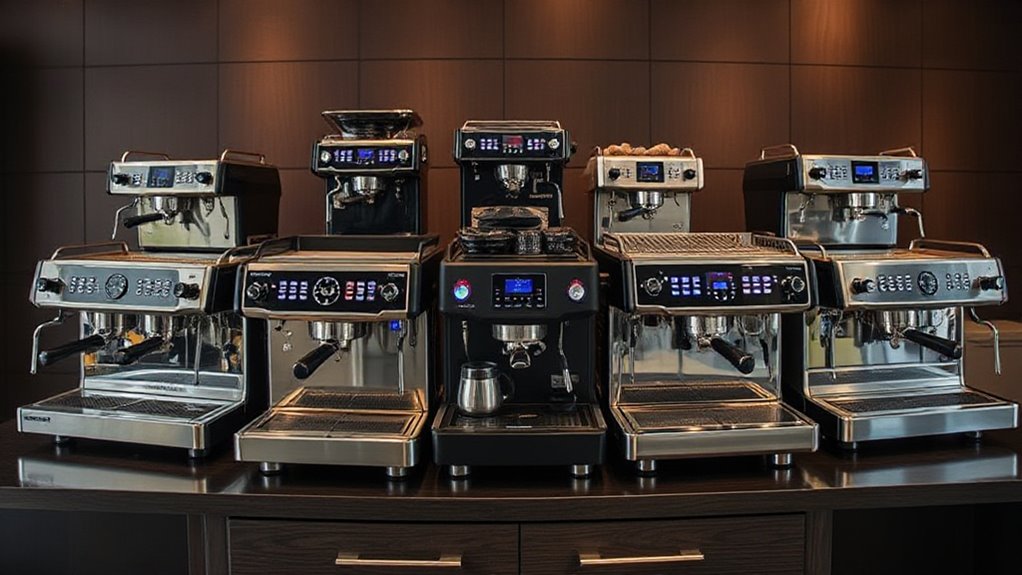 Choosing a commercial espresso machine under $2000 requires considering how versatile it is for different brewing needs. I look for machines with multiple brew sizes and adjustable shot volumes, so I can craft everything from single shots to larger drinks. Built-in grinders with customizable settings allow me to experiment with various coffee beans and flavor profiles. Features like hot water dispensers let me prepare teas and other hot beverages alongside espresso. Pre-infusion and temperature control options give me control over brewing styles, ensuring consistent results. Compatibility with different filter baskets and accessories allows me to customize extraction and beverage options easily. Overall, a versatile machine broadens my menu and adapts to different preferences, making it a smarter investment for any busy coffee environment.