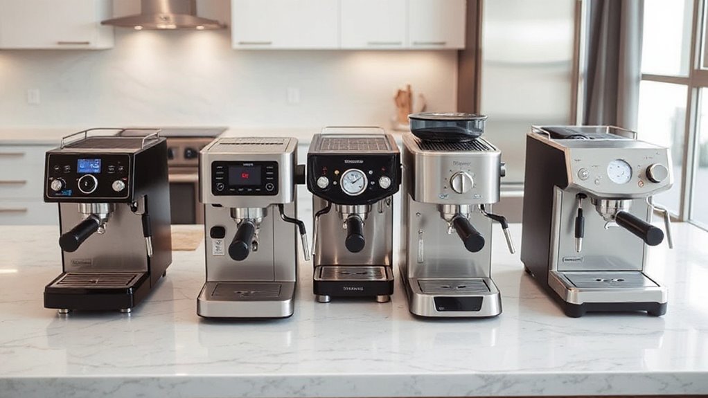 Considering the range of additional features and accessories available can considerably enhance your espresso experience and make maintenance more straightforward. Accessories like tampers, milk pitchers, cleaning tools, and filters improve brewing quality and simplify upkeep. Features such as programmable shot volumes, pre-infusion, and precise temperature controls let you customize each brew to your taste. Built-in grinders or compatibility with external grinders ensure freshly ground coffee for better flavor extraction. Dual boiler machines often come with cup warmers, hot water dispensers, and automatic frothing systems, adding convenience. Safety certifications and user-friendly cleaning features like removable drip trays and descaling alerts help maintain long-term performance and reliability. These extras make your espresso setup more efficient, enjoyable, and easier to care for over time.