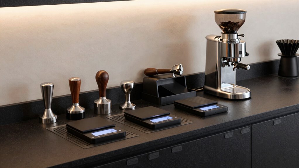 A clean and well-maintained espresso tool station keeps my workspace hygienic and ready for daily use. To achieve this, I look for organizers with smooth surfaces and minimal crevices, which prevent dirt buildup and make cleaning easier. Removable components like silicone mats or trays are a big plus because they allow quick sanitation. Materials such as sealed wood, impact-resistant plastic, or stainless steel resist moisture and stains, simplifying maintenance. I also prefer surfaces that are wipe-clean or dishwasher-safe, saving time and effort. Design elements that enable easy disassembly are essential for thorough cleaning of all parts, ensuring long-term hygiene and preserving my tools. Overall, ease of cleaning helps me maintain a tidy, functional, and durable espresso station.