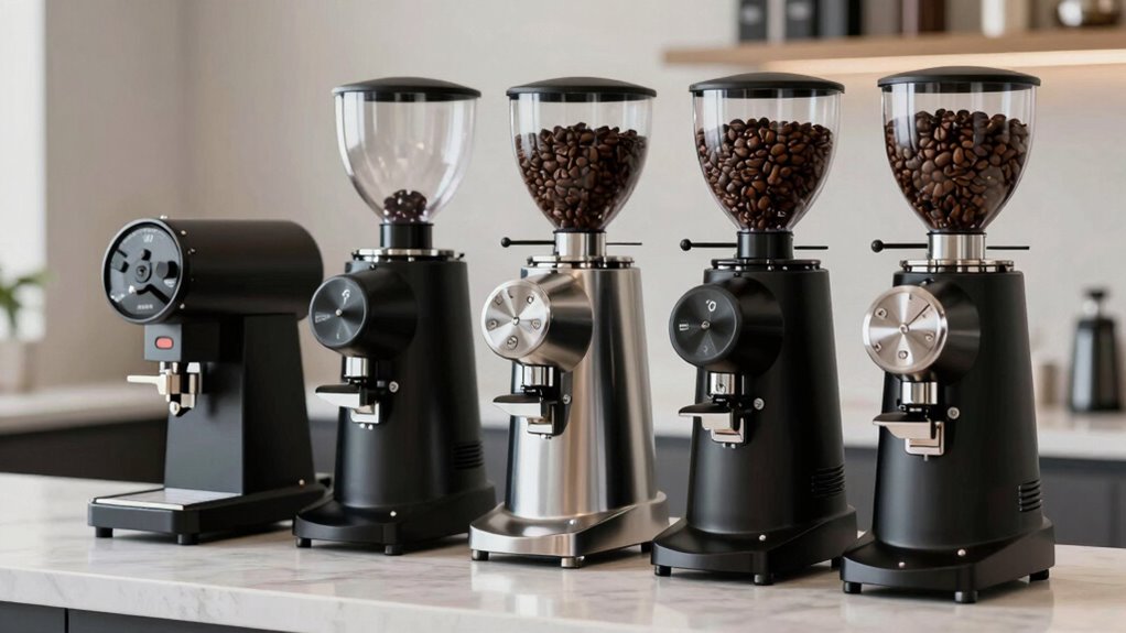 Choosing a flat burr espresso grinder with precise adjustment features is vital for dialing in the perfect shot. Fine-tuning grind size allows me to match extraction requirements and achieve ideal flavor. High-quality grinders often offer a wide range of settings, with incremental adjustments as small as 0.1 microns or seconds, giving me granular control. Digital or electronic timers help guarantee consistent dosing by setting exact grind durations, which improves shot reproducibility. Some grinders also feature numbered or labeled settings, making it easy to quickly select and replicate my preferred grind size. The ability to make micro-adjustments is essential for tailoring extraction based on bean type and brewing preferences, ensuring I get the best flavor and aroma from every espresso.
