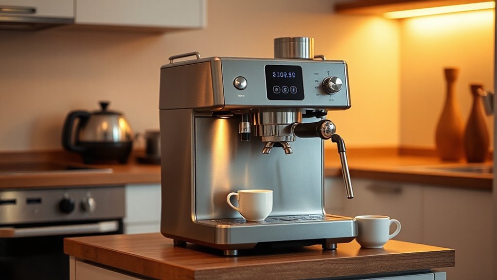 Choosing an espresso machine that visually complements your small kitchen is essential for creating a cohesive and inviting space. I look for designs that match my existing decor, such as stainless steel finishes or minimalist styles, which help the machine blend seamlessly. Compact and sleek models are perfect for small kitchens because they maximize counter space without adding clutter. I also consider the color and style, ensuring they harmonize with other appliances for a unified look. Opting for a machine with modern or classic aesthetics can elevate the entire kitchen’s ambiance and reflect my personal taste. Visual elements like clean lines, integrated controls, and quality materials influence how well the machine fits into my space, making it both functional and stylish.