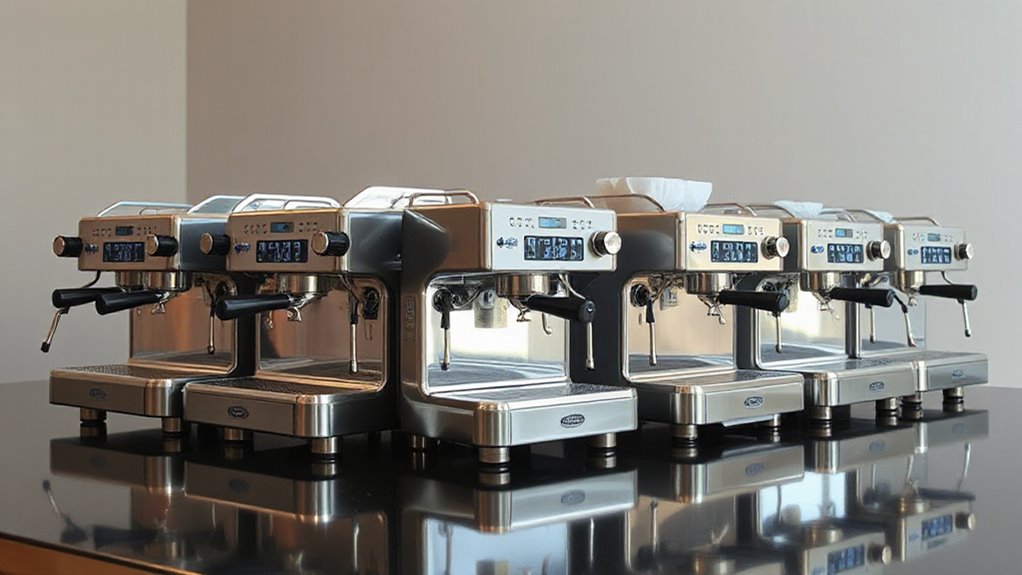 When evaluating heat exchanger espresso machines under $1500, build quality and durability stand out as top priorities. I look for machines with a sturdy stainless steel or commercial-grade metal build, which can handle frequent use without faltering. The boiler and heat exchange components should be made of corrosion-resistant materials like brass or stainless steel, ensuring they last over time. Well-made machines also feature reinforced internal piping and fittings that resist leaks and pressure fluctuations, which is critical for longevity. Consistent temperature control, supported by quality thermostats and insulation, helps prevent overheating and instability. Overall, I prefer machines with solid craftsmanship, tight fittings, and minimal plastic in critical areas, as these elements guarantee long-term durability and reliable performance.