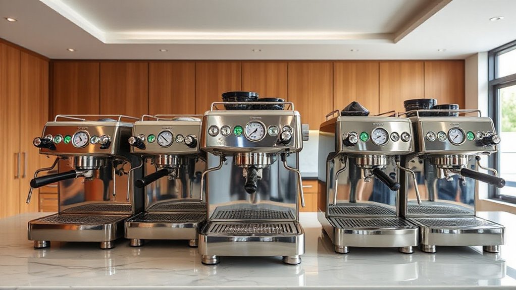 Maintaining precise temperature control is essential for achieving consistent espresso quality, especially in a heat exchanger machine under $3000. PID technology plays a pivotal role here, ensuring stable water temperatures during brewing and steaming, which prevents fluctuations that can compromise flavor. Heat exchanger systems allow simultaneous brewing and steaming without temperature drops, streamlining workflow. Stable boiler temperatures help maintain shot consistency and enhance flavor extraction. Adjustable temperature settings provide flexibility, letting me fine-tune for different beans and brewing styles. However, to keep temperature stability long-term, regular calibration and monitoring are indispensable. By prioritizing these features, I can guarantee my machine consistently delivers ideal espresso results, making it a worthwhile investment within this budget range.
