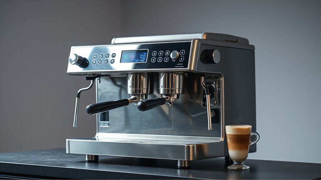 Ensuring precise temperature control is essential when selecting a heat exchanger espresso machine that delivers strong steam, as it directly impacts performance and consistency. PID systems are a game-changer, offering stable brewing and steaming temperatures that guarantee every shot is consistent. Manual adjustments give baristas the flexibility to fine-tune heat levels, accommodating different beans and brewing styles. Digital temperature displays make monitoring quick and straightforward, helping prevent overheating or underheating during operation. The ability of a heat exchanger to maintain separate, stable zones for brewing and steaming boosts control and efficiency. Overall, reliable temperature management minimizes flavor fluctuations, guaranteeing optimal extraction, rich crema, and perfect microfoam every time. This level of control is crucial for both quality and confidence in your espresso-making.