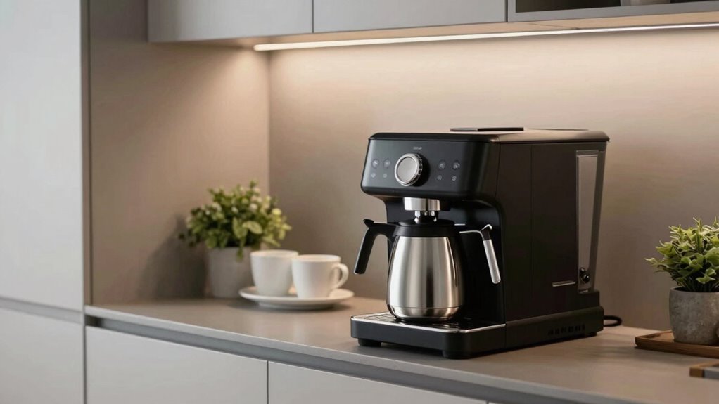 Maintaining precise temperature control is vital for extracting the best flavors from your coffee, especially in high-end drip machines with thermal carafes. Accurate temperature regulation ensures ideal extraction, highlighting the coffee’s rich aroma and complex taste. Many premium models feature PID temperature control, maintaining water within a narrow range to deliver consistent results. Adjustable temperature settings let you customize brewing warmth to suit your preference or specific beverages. Staying within the perfect brewing temperature window of 195°F to 205°F is essential for professional-quality coffee at home. Advanced machines may include temperature sensors and digital displays, enabling real-time monitoring and adjustments during brewing. This precision helps you achieve a perfect cup every time, making your small kitchen setup both efficient and satisfying.