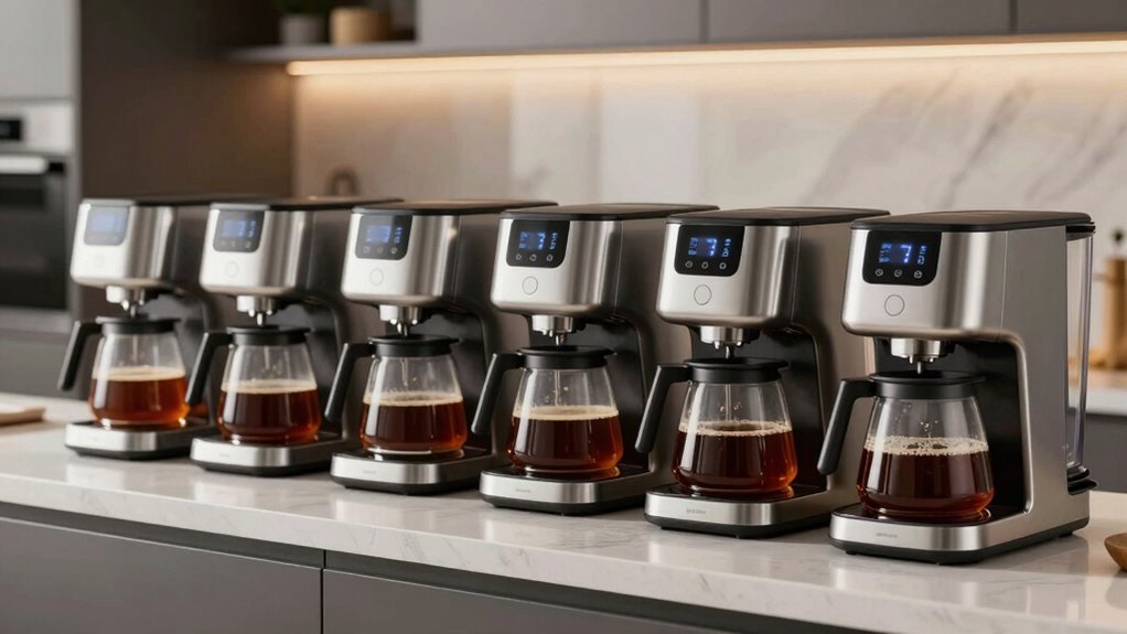 These high-end drip coffee makers are quite energy-efficient, often featuring automatic shut-off and programmable settings that help conserve power when not in use. I find that their thermal carafes keep coffee hot without needing to leave the machine on continuously, saving energy. Plus, many models are ENERGY STAR certified, so they meet strict standards for efficiency. Overall, they strike a good balance between performance and energy savings.