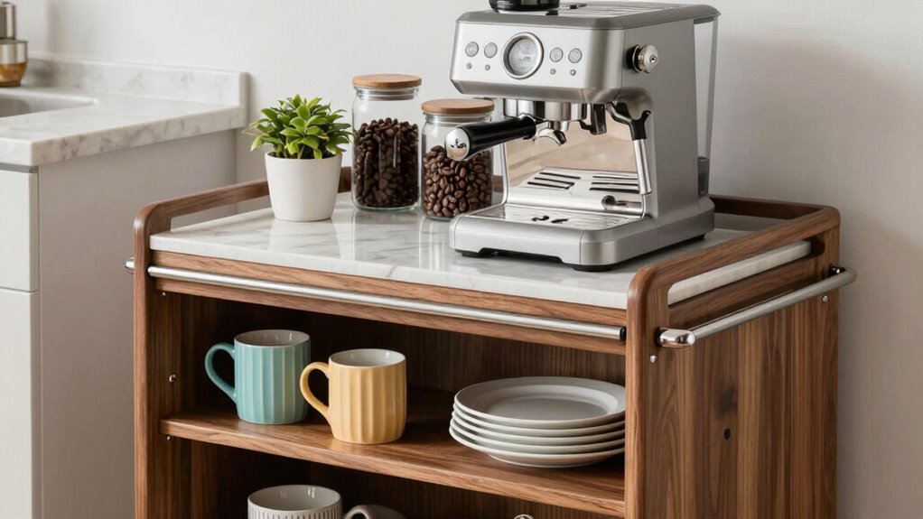 Choosing the right kitchen cart is like finding the perfect mug—it makes your coffee experience complete. With so many options, focus on size, storage, and style that match your space and needs. Think of your coffee station as a cozy corner where every detail matters. When you pick the right cart, it’ll serve as the heart of your mornings, turning simple sips into warm, comforting rituals you’ll cherish every day.