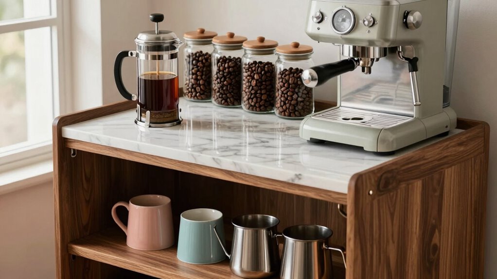 If you’re wondering whether a kitchen cart truly elevates your coffee experience, the answer is yes—when chosen wisely. These carts aren’t just storage; they can transform your space into a cozy coffee haven. Imagine a dedicated spot for your favorite beans and brewing gear, making every morning special. So, go ahead, invest in one—you might find that it’s the secret to brewing better coffee and enjoying it even more!