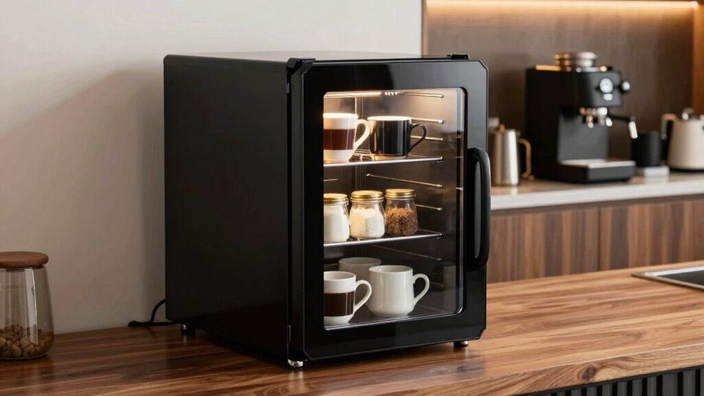 Choosing the right mini fridge for your coffee bar really comes down to understanding your needs. I’ve found that size, storage options, and features like LED lighting or glass doors make all the difference. It’s almost like a little science—matching the fridge to your space and style guarantees your coffee setup feels both functional and inviting. Trust your instincts, and you’ll create a perfect cozy corner that fuels your mornings with ease.