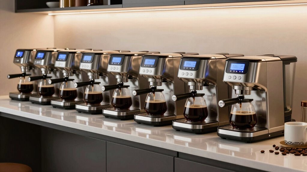 Choosing a SCA certified drip coffee maker means paying close attention to brewing precision, which directly impacts the flavor and aroma of your coffee. Precise temperature control, usually between 197-204°F, ensures ideal extraction of flavors and aromas in each brew. Consistent water distribution, facilitated by specialized showerheads, promotes even saturation of the grounds, resulting in balanced flavor. SCA certification guarantees the machine meets strict standards for brewing parameters like temperature, flow rate, and extraction. Features like pre-infusion or bloom cycles further enhance flavor extraction by evenly wetting the coffee grounds before brewing begins. When your coffee maker maintains accurate brewing parameters consistently, you’ll enjoy café-quality coffee at home—rich, clear, and full of nuanced flavors. Brewing precision truly makes all the difference.
