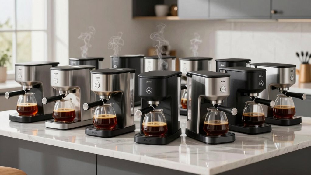 When choosing an SCA certified drip coffee maker for specialty brews, considering the design and ease of use is vital to guarantee a seamless brewing experience. A well-designed model features intuitive controls and clear displays, making operation straightforward. Programmable timers and preset brew strengths simplify daily routines, saving time and effort. Ergonomic features like removable water reservoirs and dishwasher-safe components enhance convenience and ease cleaning. Modern designs often incorporate sleek finishes and compact dimensions, allowing the coffee maker to blend effortlessly into various kitchen styles. Clear instructions and accessible maintenance features also help guarantee proper use, leading to consistent brewing results. Overall, a user-friendly design enhances your brewing experience and helps you get the most out of your high-quality coffee.