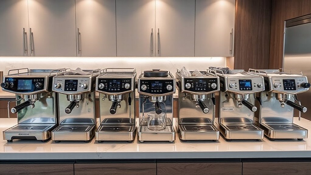 When selecting a semi-automatic espresso machine under $3000, understanding the warranty options is vital for peace of mind. Most models in this price range come with warranties lasting one to two years, covering defects and malfunctions. Some manufacturers offer extended warranties or additional coverage, which can be worth considering for extra protection. It’s essential to verify what components are covered, such as the boiler, grinder, or electrical parts, to guarantee thorough coverage. Generally, higher-priced models tend to offer longer or more extensive warranties, reflecting their quality and durability. Before making a purchase, I always review the warranty terms carefully—knowing the procedures for repairs, replacements, and customer support can save a lot of hassle later on.