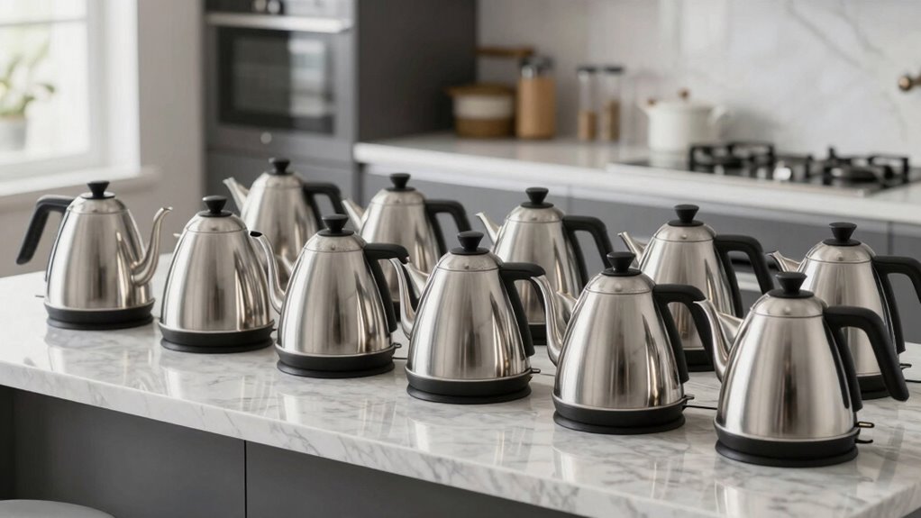 Most stainless steel electric gooseneck kettles under $250 include safety features like automatic shut-off when boiling is complete, boil-dry protection to prevent damage if the kettle is empty, and cool-touch exteriors to avoid burns. Many also have secure locking lids and non-slip bases for stability. These features give me peace of mind, ensuring safe use while I focus on enjoying a perfectly brewed cup.