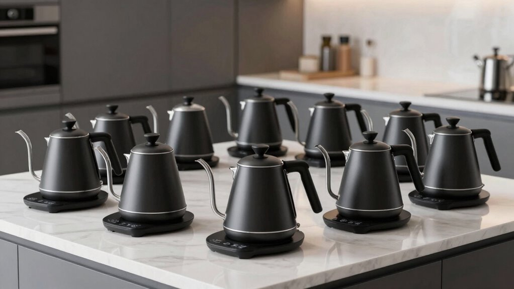Since the design and aesthetic appeal of a gooseneck kettle can considerably enhance my kitchen’s look and feel, I pay close attention to color options, finishes, and overall style. I prefer sleek, minimalist designs that blend seamlessly with modern decor. Material choices like matte, gloss, or brushed finishes not only influence the kettle’s appearance but also help hide fingerprints and smudges. Elegant details such as a sculpted gooseneck spout and an ergonomic handle add sophistication and improve usability. A well-designed digital display and control interface can elevate the overall look, giving the kettle a modern, high-end vibe. Ultimately, choosing a visually appealing kettle makes my brewing routine more enjoyable and complements my kitchen’s style.