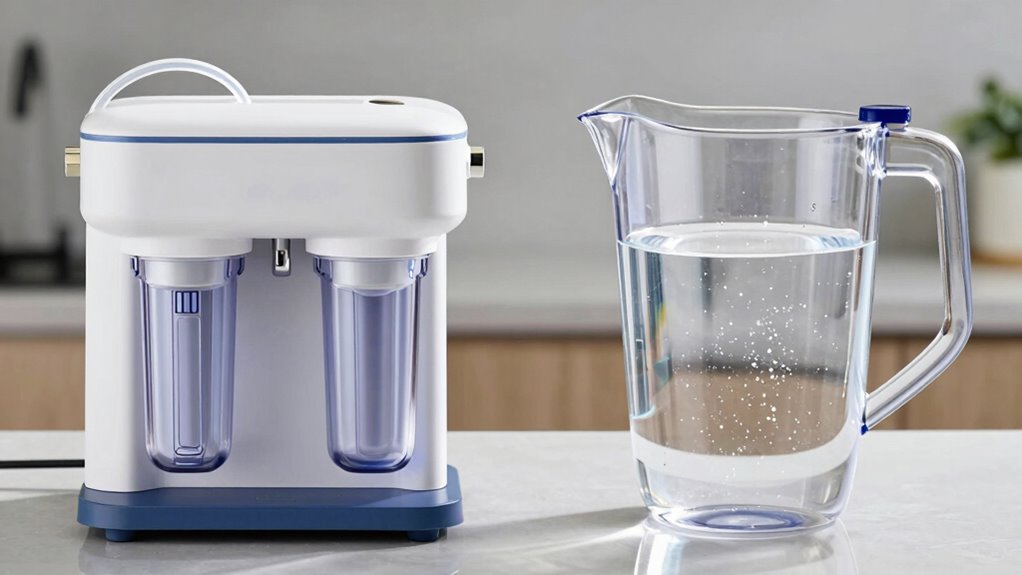 Under-sink filters typically improve taste more than pitchers because they remove a broader range of contaminants and reduce minerals like calcium, which causes scale. They also help prevent buildup in pipes and appliances by controlling mineral levels. Pitchers offer moderate improvements but often don’t target scale or heavy metals as effectively. If you want better long-term water quality and fewer scaling issues, under-sink systems are usually the better choice—learn more to make an informed decision.